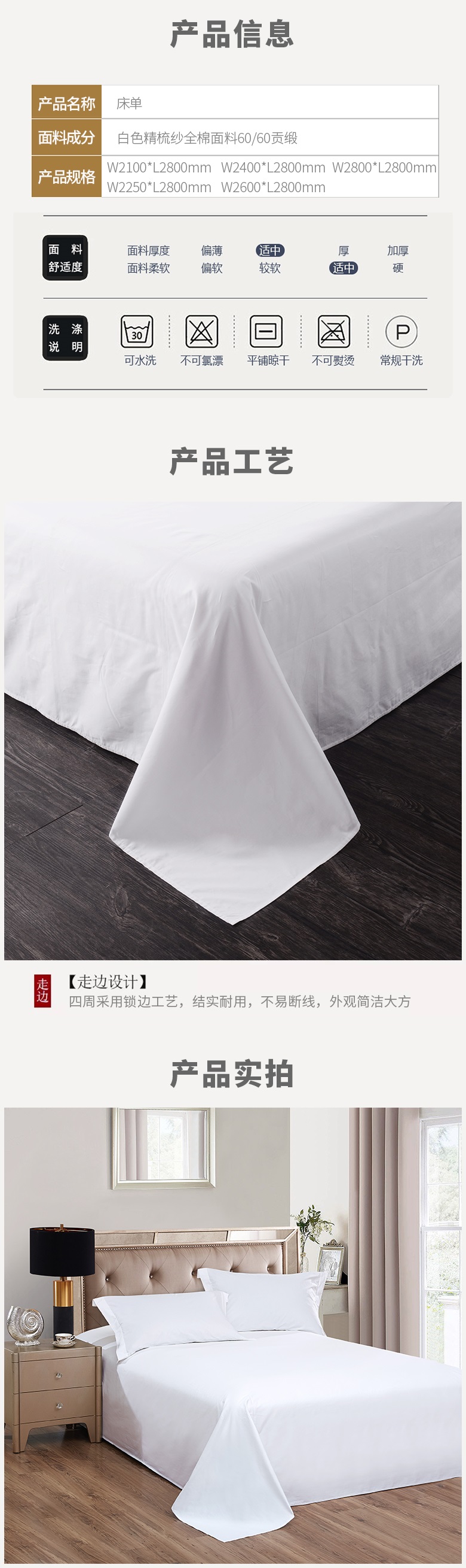 款式:2米床单 W3000*L2800MM 60*60/200*80+80大丝光贡缎+CM四面卷边 CS6060200C