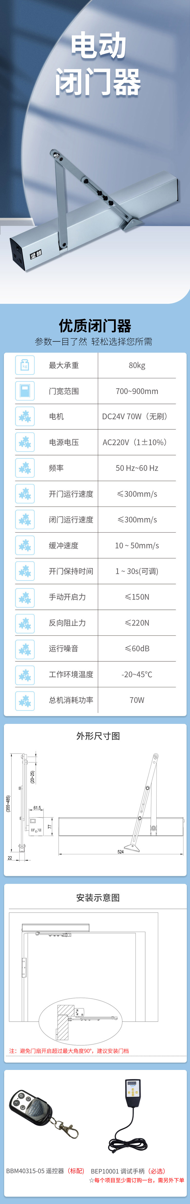 电动闭门器 银灰色 单个主体 配摇臂组件/遥控器 中文 每项目至少1套调试手柄BBP80001,另下单 FB BBD40208
