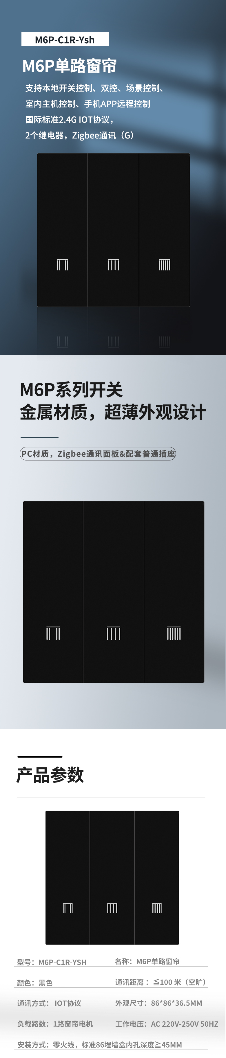 M6P三路开关 PC款,3个继电器,Zigbee通讯 G 黑色 M6P-K3-Ysh