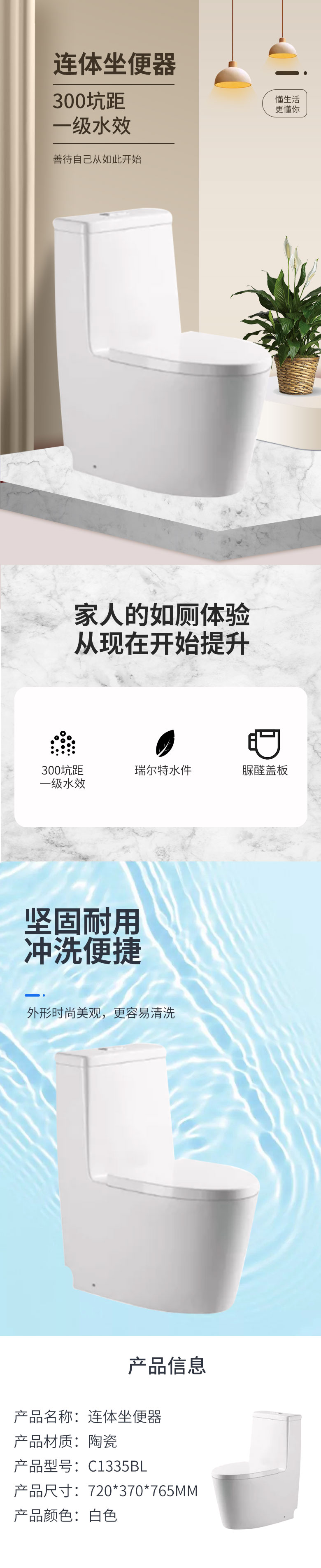 斯飞奥连体坐便器 720*370*765MM 陶瓷 305坑距 一级水效、瑞尔特水件、脲醛盖板、超漩式虹吸 BL0035-3 C1335BL