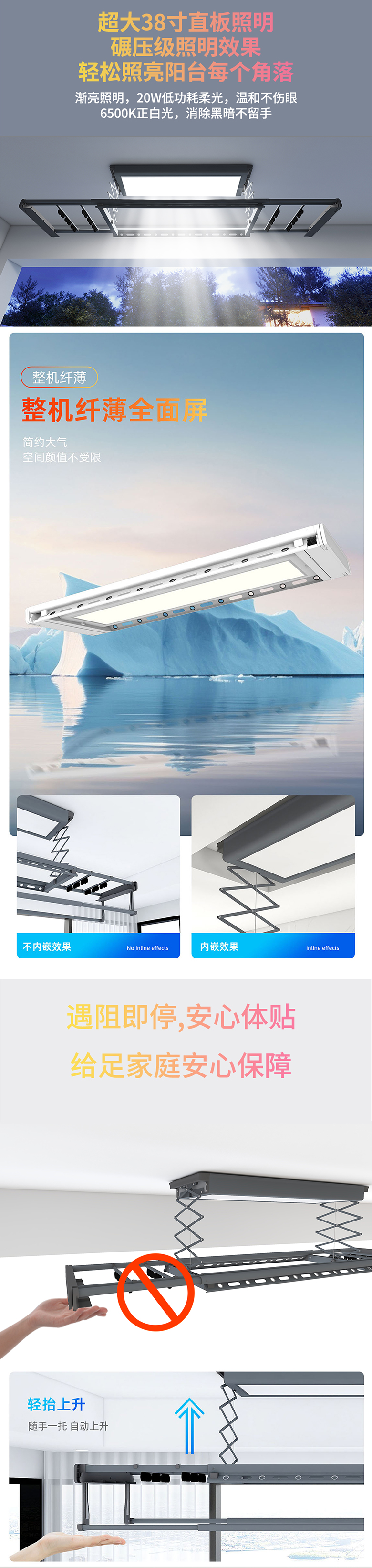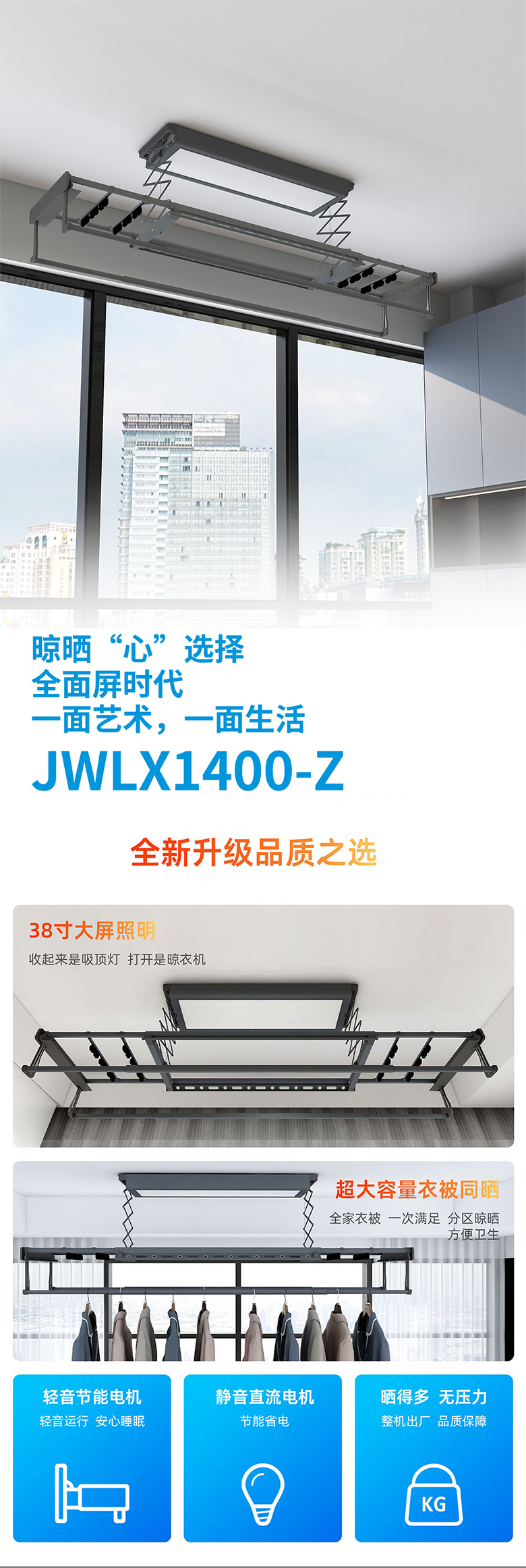 双杆智能晾衣机 主机1.2M-整杆2.2M-承重40KG-提升力35KG 铝合金 银白 遥控+照明 JWLX20-Z