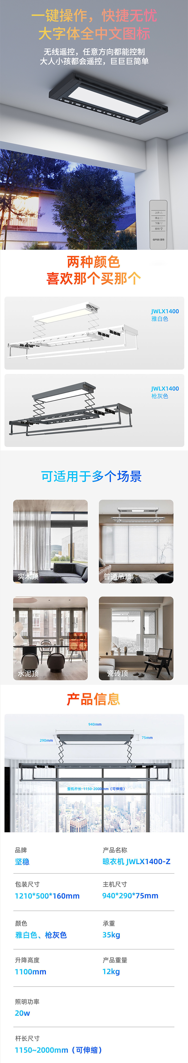 智能晾衣机 主机1.2M-整杆伸缩1.35~2.2M-承重40KG-提升力35KG 铝合金 银白 JWLX800-FX-S