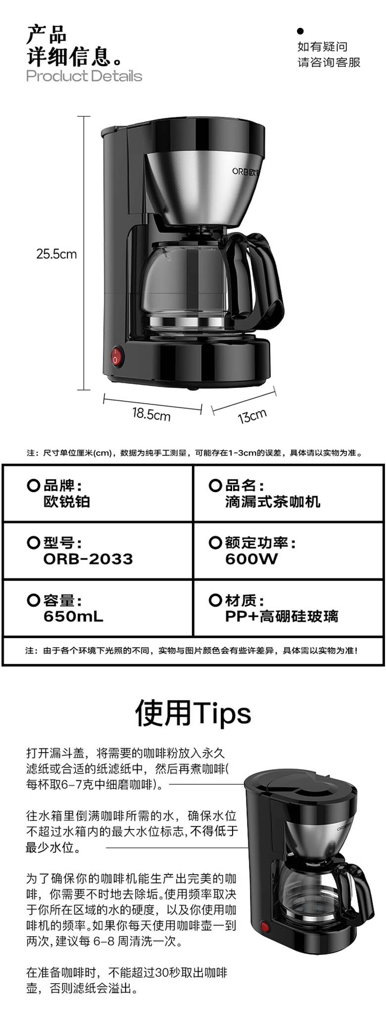 咖啡机 ORB-2033 欧锐铂 650ml DSL-0687