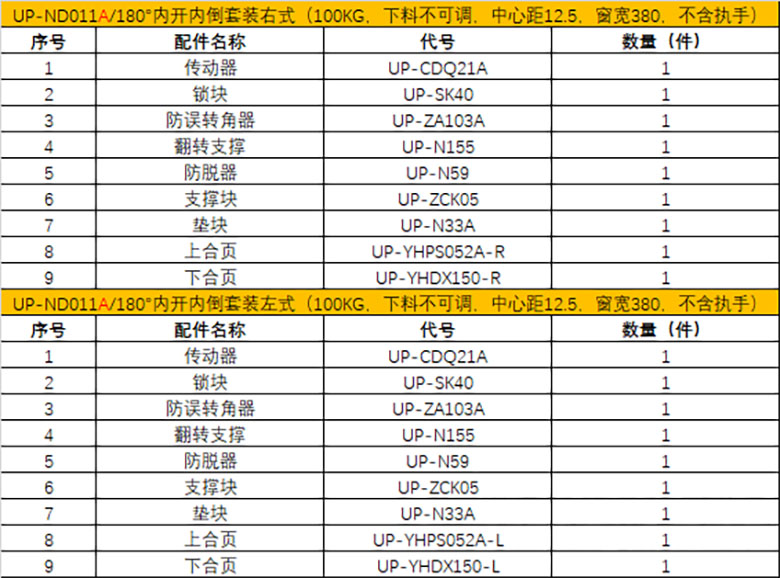 90°内开内倒套装(70KG 下料不可调 中心距15 不含执手)